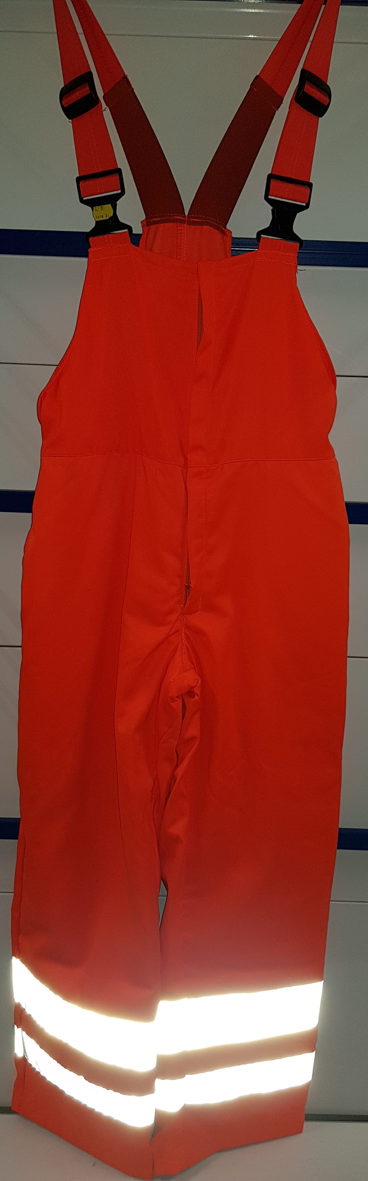 Παντελόνι με τιράντες σε φθορίζον πορτοκαλί χρώμα. Προστατευτικο ποδιού : 9 στρώματα μπρος και 5 cm πάνω από την εξωτερική ραφή στο δεξί μπατζακι. Δυο τσέπες μπροστά και μια πίσω με φερμουάρ